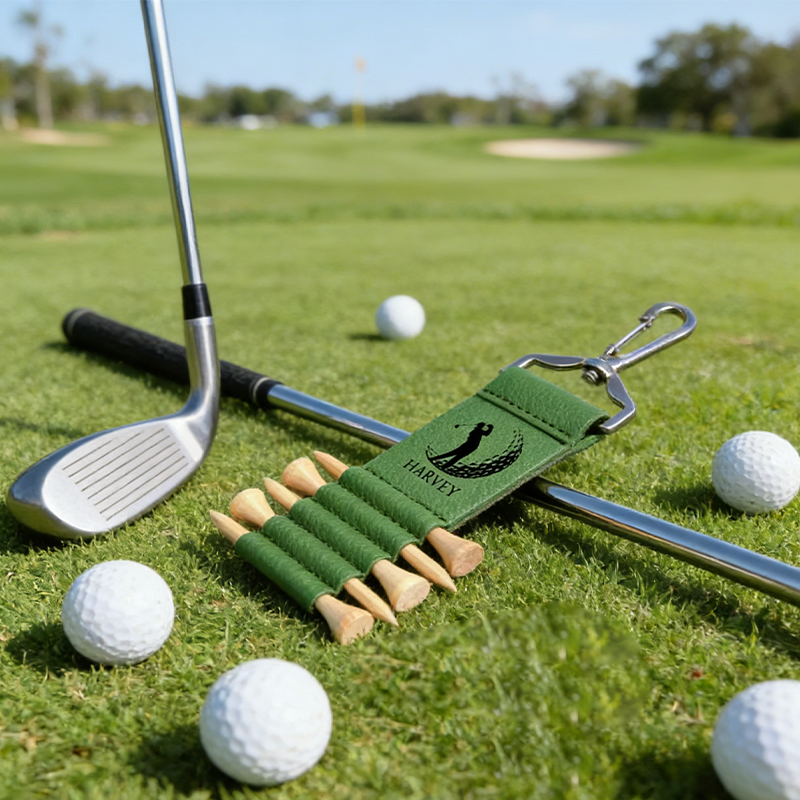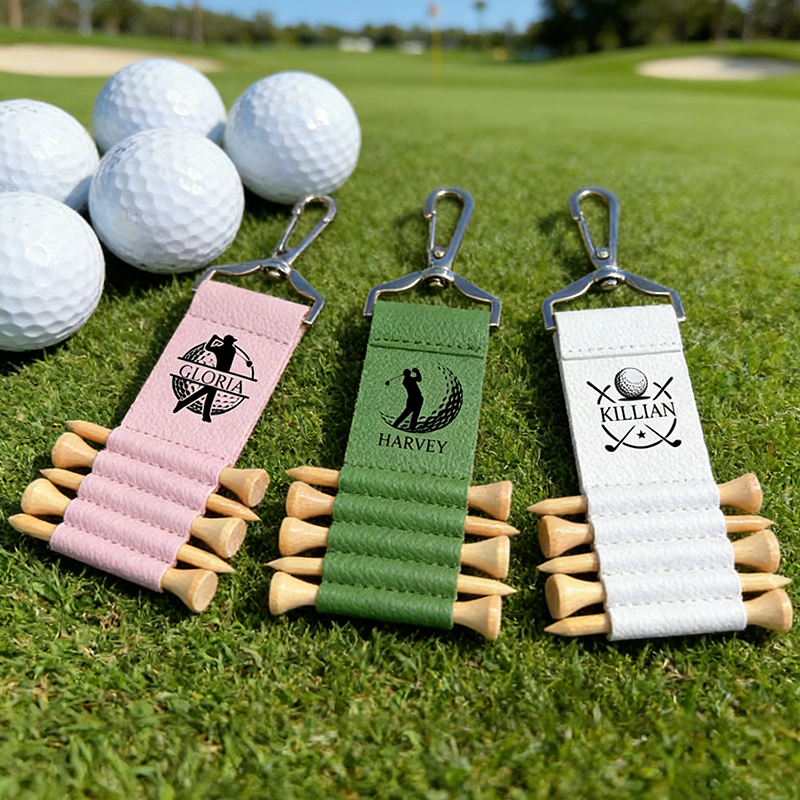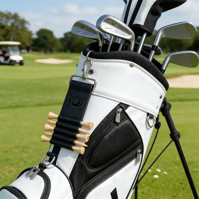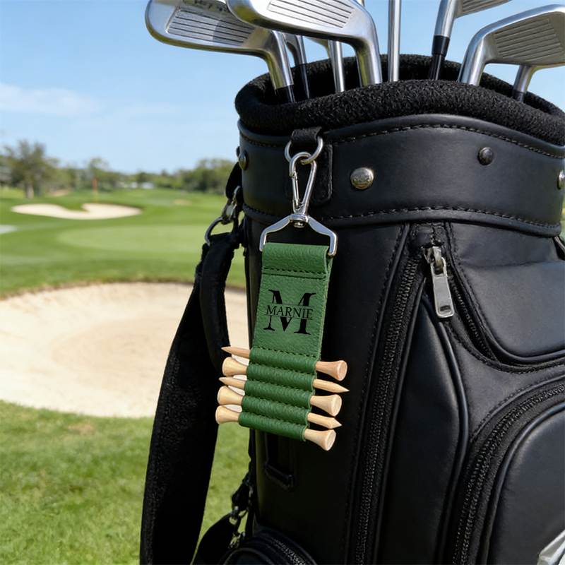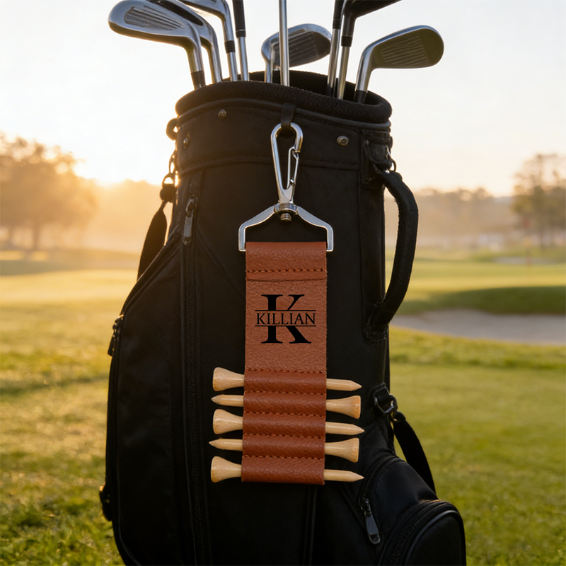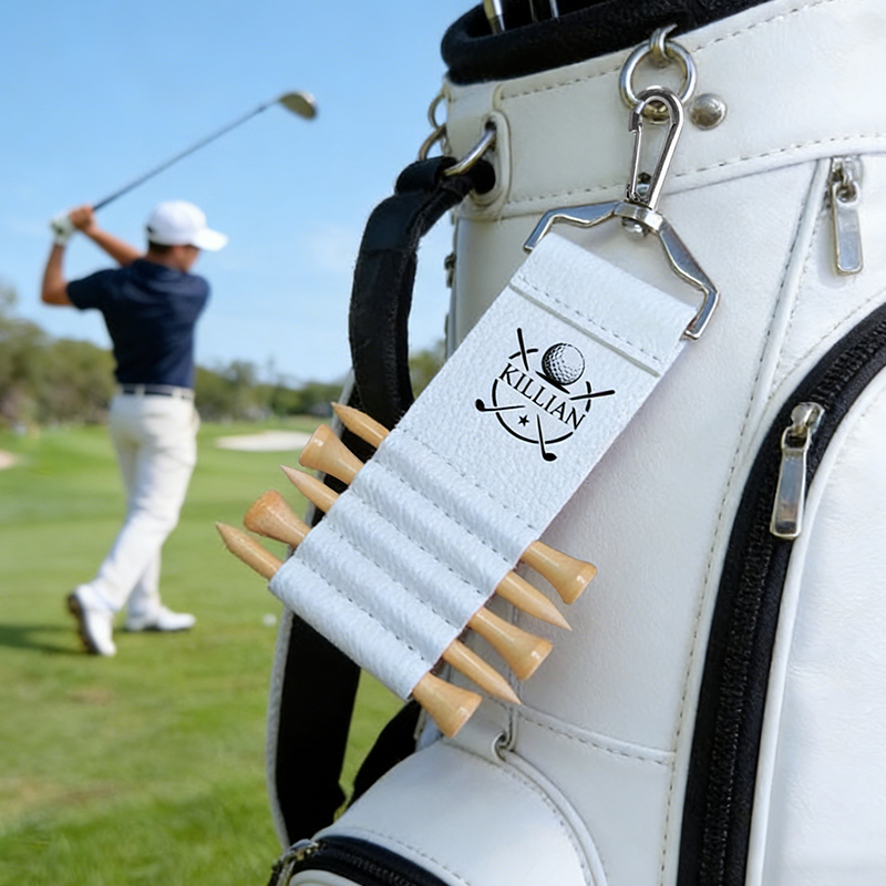 Personligt graveret læder golftaskemærke med teeholder. Brugerdefineret gave til golfelskere.